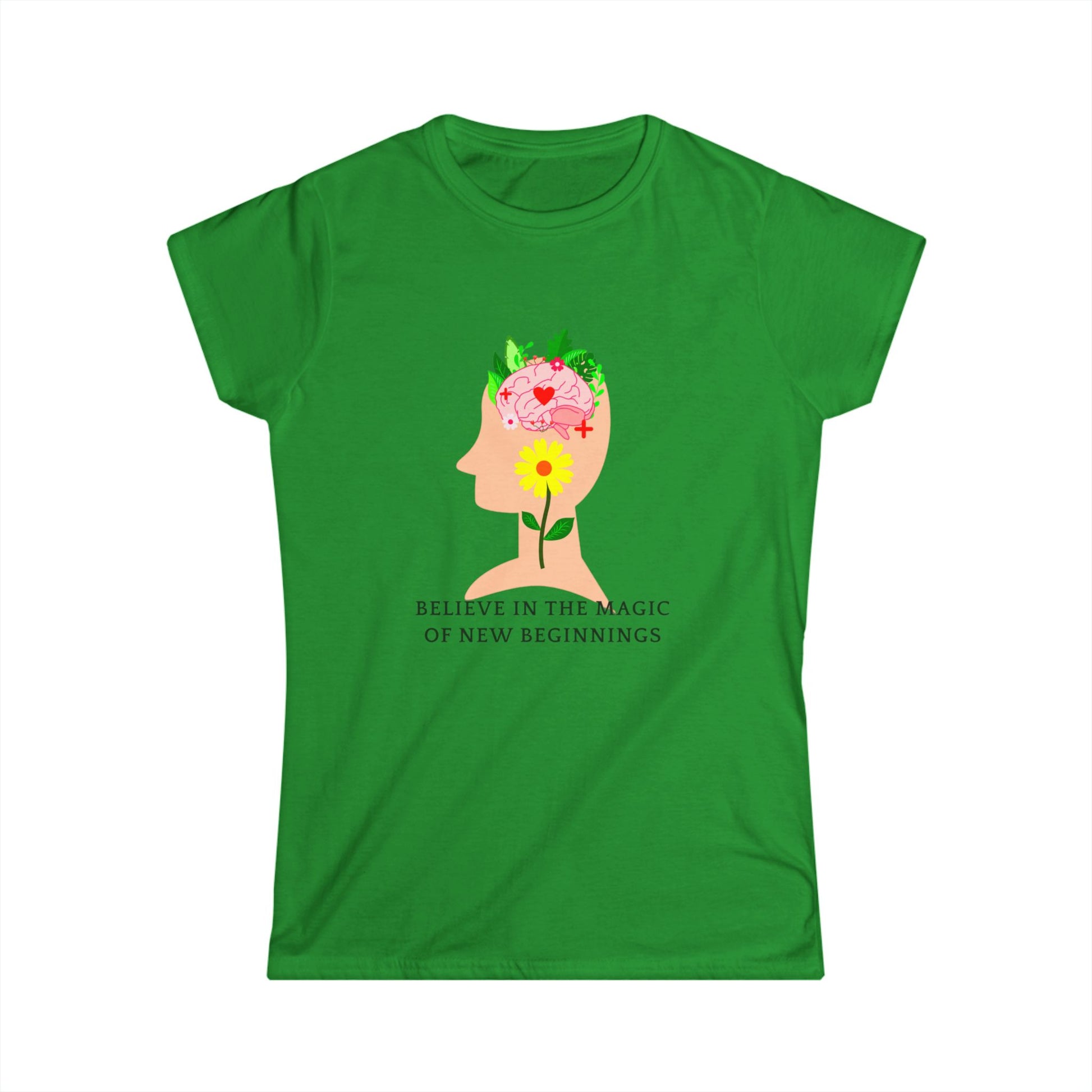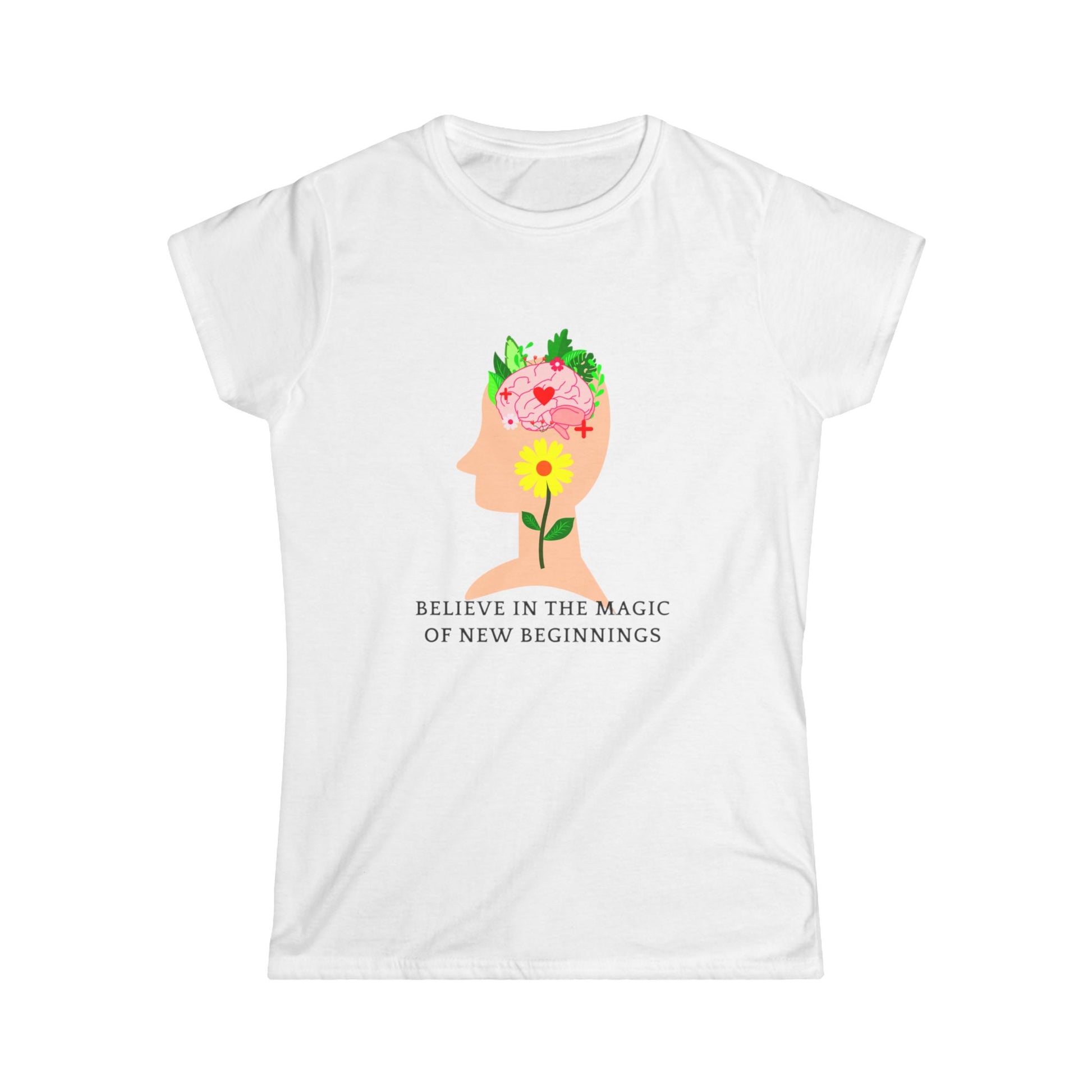 Introducing our women's Softstyle tee, designed to inspire positivity and personal growth. This beautiful shirt encourages you to believe in the magic of new beginnings. Perfect for those who value motivation and self-expression, it seamlessly fits any casual style. Its lightweight fabric and semi-fitted cut provide all-day comfort, ideal for everyday wear, yoga sessions, or coffee dates with friends. Celebrate transformative moments with this stylish tee - an ideal gift for birthdays, new beginnings, or simply to brighten someone's day. Suitable for adults, this shirt is an inspiring addition to any collection during any season of reflection and renewal.